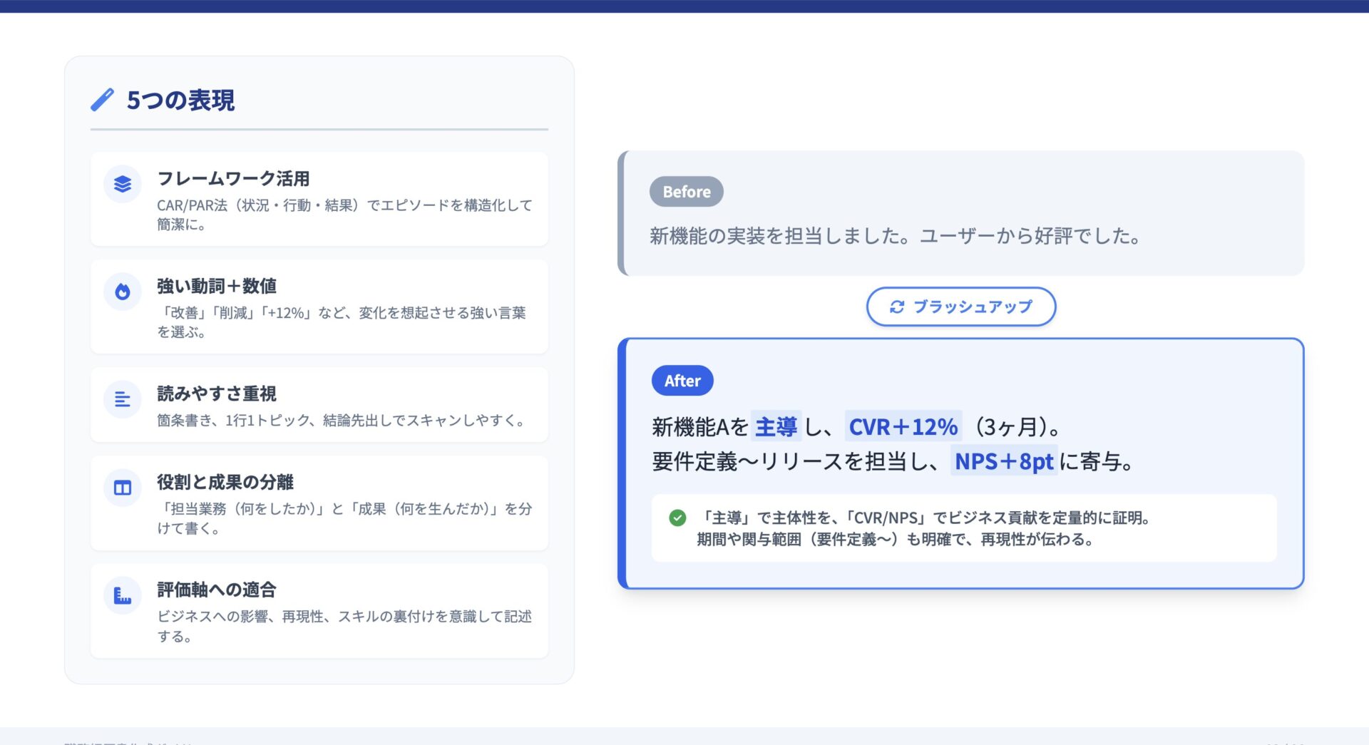 例えば、「圧倒的なスキル」や「唯一無二の成果」といった表現を多用することは、かえって信頼性を損なう可能性があります。