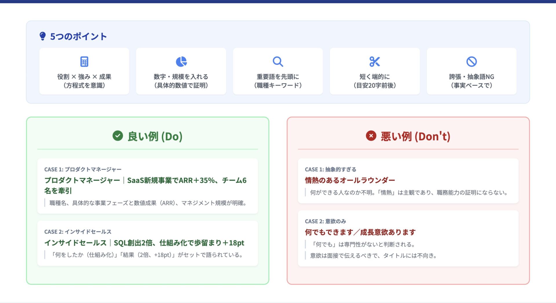 そのため、タイトルには「この人の経歴をもっと知りたい」と思わせる具体性と魅力が求められます。明確かつ簡潔なタイトルは、自分の経験やスキルを効果的にアピールする第一歩となります。